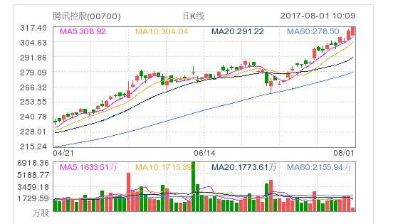 騰訊繼昨日大漲後,今早低開後震蕩上漲,盤中漲近1%,報317港元,股價再創上市新高,市值突破3萬億港元。