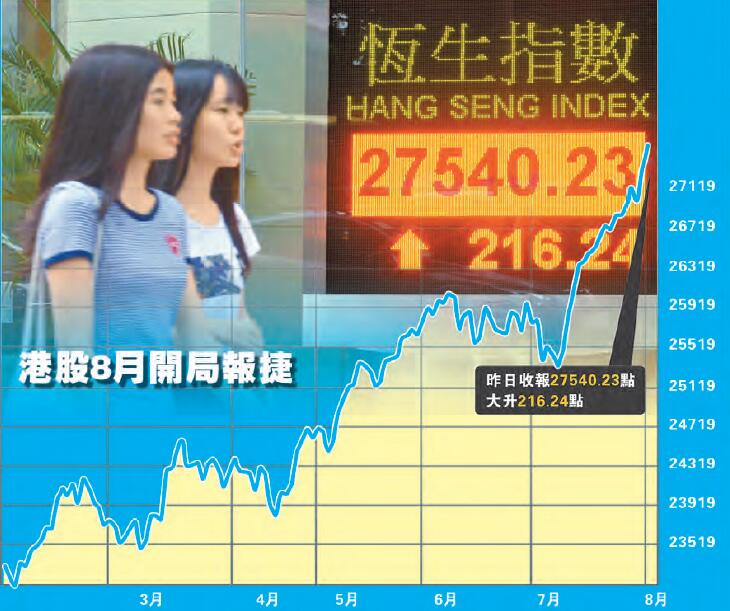 【香港商報网訊】記者潘晶報道:港股7月創下10年來首次月度七連升后,於8月第一天繼續迎來升勢。恒指昨日早上高開后,午后最多升234點,見27558點,再創近26個月來高位。全日最終收報27540點,升216點或0.8%。大市全日成交額為1032.87億元,較前日多約19%,為今年6月中以來首次突破單日千億元成交。