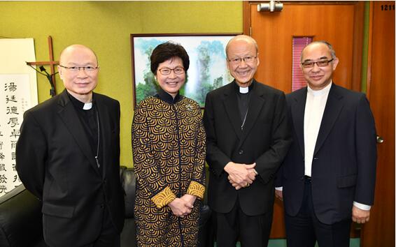 林鄭月娥(左二)今年4月候任期間曾拜訪湯漢(右二)及楊鳴章(左一)。