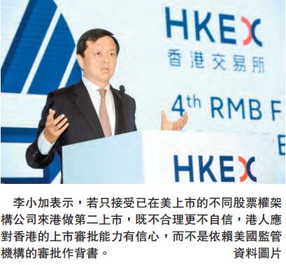 李小加表示,「我們香港是第一個吃螃蟹的人,若只接受已經在美國上市的不同股票權架構公司來香港做第二上市,既不合理更不自信,港人應對香港的上市審批能力有信心,而不是依賴美國監管機構的審批作背書。」