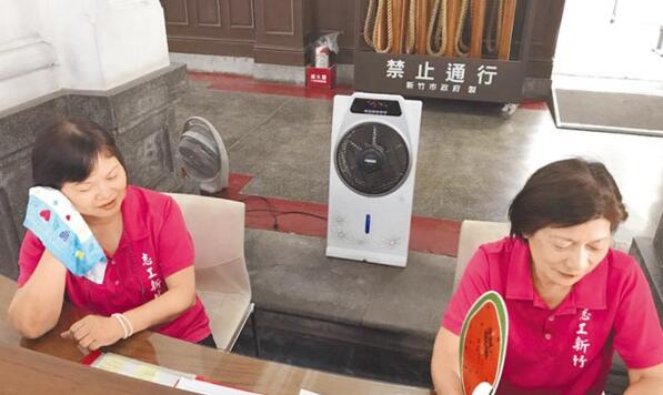 新竹市政府原則上配合關冷氣節電的政策,原本就沒空調吹的市府志工靠電扇、搖扇子度過悶熱。(圖片來源:台灣《中時電子報》)