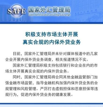 國家外彙管理局積極支持包括銀行和企業在內的市場主體開展真實合規的內保外貸業務。