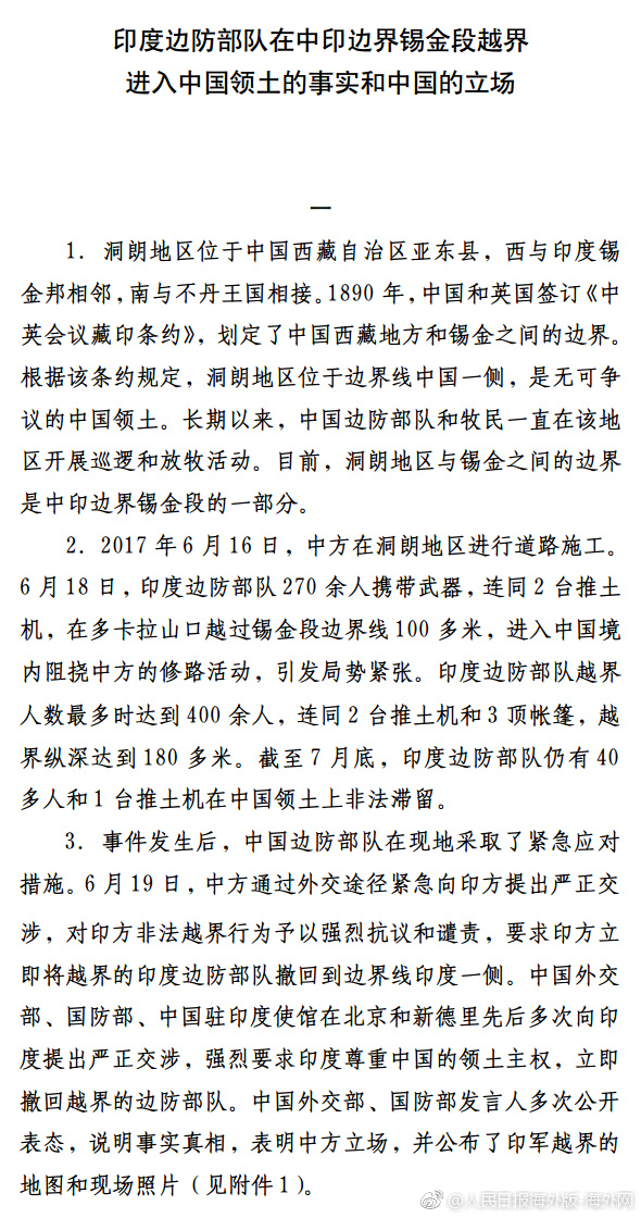 中國外交部在文件中重申,6月18日以來,印度邊防部隊非法越過中印錫金段邊界進入了中國領土,這是不容否認的事實。此次事件發生在邊界線清楚的已定界地區,與過去雙方邊防部隊在未定界地區發生的摩擦有著本質區別。印度邊防部隊越過既定邊界,侵犯了中國主權和領土完整,違反了1890年條約,違反了《聯合國憲章》,是對國際法基本原則和國際關系基本準則的粗暴踐踏,性質非常嚴重。