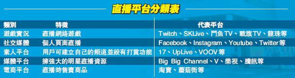 直播是近年來最火的互聯網產品,直播平台大致上可分為遊戲實況、社交媒體、素人平台、媒體平台及電商平台五類。當中,社交媒體直播以個體戶為主,僅具備直播和觀眾互動功能,粉絲群基礎決定了觀眾的數目。