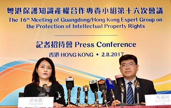 知識產權署署長梁家麗(左)及廣東省知識產權局局長馬憲民在粵港保護知識產權合作專責小組第16次會議記者會上發言。