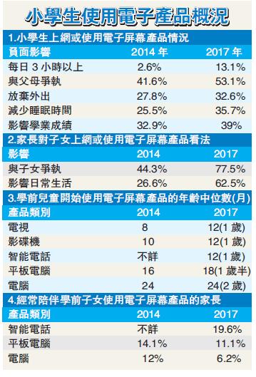 衛生署今年7月以問卷形式,在母嬰健康院、學生健康服務中心訪問1328名市民,包括:766位學前兒童(0至6歲)、482個小學生及80名家長,了解兒童使用互聯網及電子屏幕產品的情況和帶來的影響。調查結果顯示,學前兒童平均1歲至18個月大開始使用智能電話、平板電腦等電子產品,年齡中位數雖較3年前進行的同一調查8至16個月推遲,惟家長經常陪伴他們使用平版電腦、電腦和智能電話分別只有11.1%、6.2%及19.6%,比2014年同類型調查有惡化趨勢。
