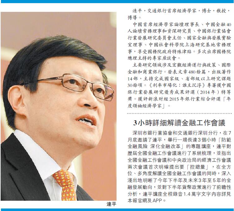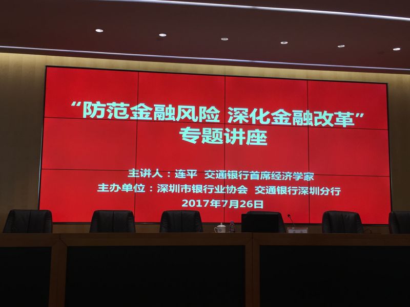 日前,深圳市银行业协会和交通银行深圳分行特别邀请了交通银行首席经济学家连平为深圳金融界做了"防范金融风险 深化金融改革"的专题讲座,以深入解读第五次全国金融工作会议的精神。连平先生现担任中国首席经济学家论坛理事长、中国银行业协会行业发展研究委员会主任、中国金融40人论坛常务理事和资深研究员、国家金融与发展实验室理事、中国社会科学院上海研究基地常务理事,上海社会科学院兼职博士生导师,享受国务院政府特殊津贴。多次出席国务院总理主持的专家座谈会。