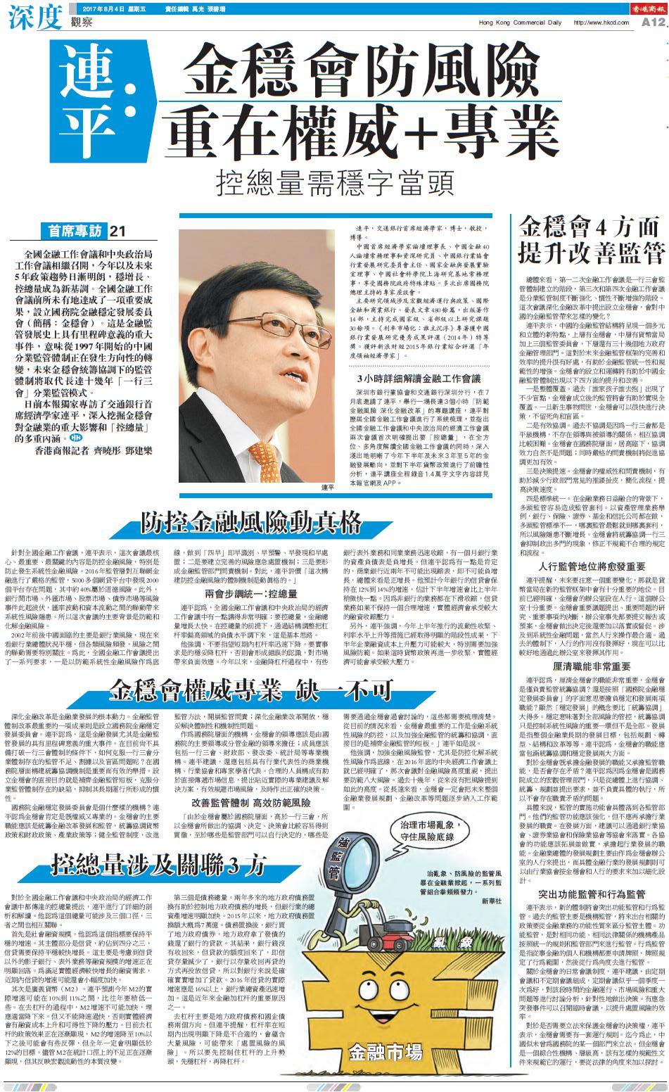 连平强调,这次的任务以及很多具体的方面都没有强调金融业的发展,更多强调的是金融业的风险。