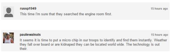有一位網友評價說,“看起來是時候在我們軍隊中放置微型芯片,以此來確定失蹤人員是跌下甲板了還是被綁架到世界的某個角落。”