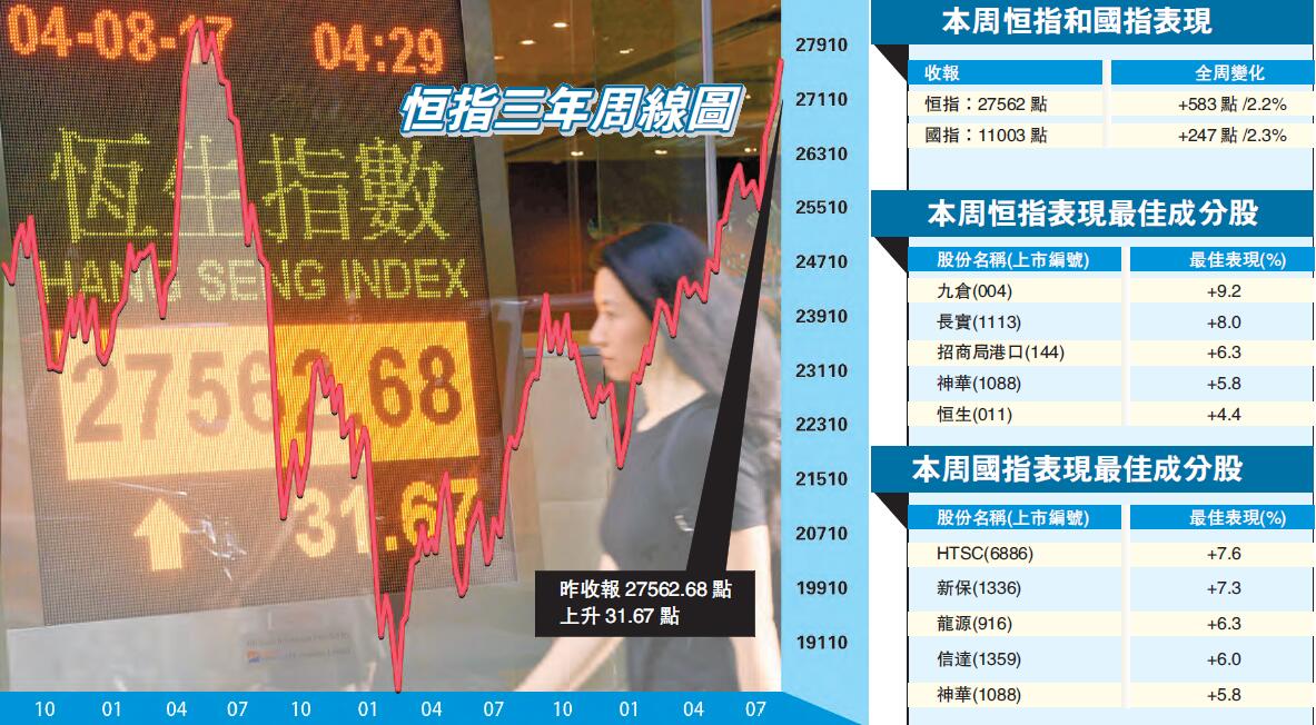 资金追捧航运港口股,中远海控(1919)及中远海发涨半成;煤炭板块则见追落后。另外,长和(001)绩后收跌3.1%,属表现最差蓝筹;同系长实地产(1113)曾破顶,收涨4.3%,为表现最佳蓝筹。全周而言,九仓(004)及长实为表现最好蓝筹成分股,分别升9.2%及8%;HTSC(6886)及新保(1336)为表现最佳国指成分股,分别升7.6%及7.3%。
