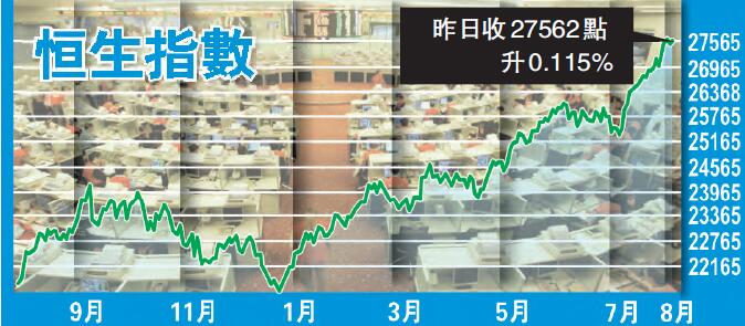【香港商报网讯】记者吴天淇报道:观望美国公布就业数据,港股昨日窄幅争持,全日大部分时间於27500点水平上落,收涨31点或0.12%,报27562点;国指涨0.88点或0.01%,报11003点。受汇控(005)业绩理想带动,港股连升第四个星期,4周累飙2221点或8.8%,按周计则涨583点或2.16%。