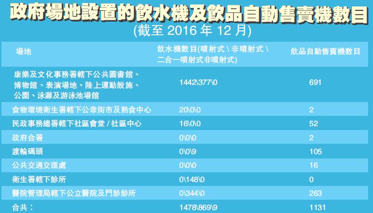 政府鼓励市民自备水壶,少买塑胶樽饮料,应适当给予市民饮水之便。据公开资料显示,截至去年12月本港共有公共饮水机2356个,包括喷射式及非喷射式饮水机两种。主要分布於康乐及事务文化署管辖下的体育馆、运动场及游泳池等,合共1819个。公共饮水点乍看甚多,可实际上并未广泛普及,特别人流量大的公共屋恏、港铁站以及大型商场,普遍没设有公共饮水机。