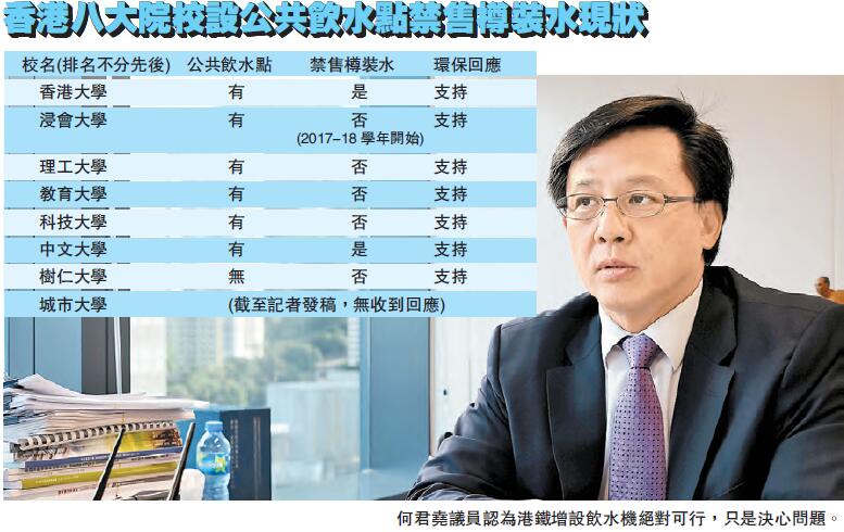除港大外,浸大已计划在2017至18学年逐步在校园停售樽装水,中大、理大等高校亦都开展相关禁售樽装水活动。值得欣慰的是,大学校园禁樽装水推行得很成功,学生乐於响应,相信这股环保风气在大学圈中形成,未来所有学校一起推行禁售樽装水的可能性愈来愈高。