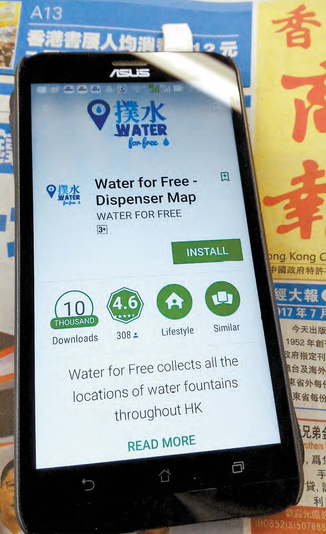 扑水APP,助找饮水机。本港不少环保组织为推动市民少买胶樽饮品付出很多心血,其中GO Green Hong Kong组织,更研发出一款手机应用程式“扑水”(Water for free),将全港可供公众饮水的地点收集起来,方便港人查阅,目前收集地点已经逾900个。