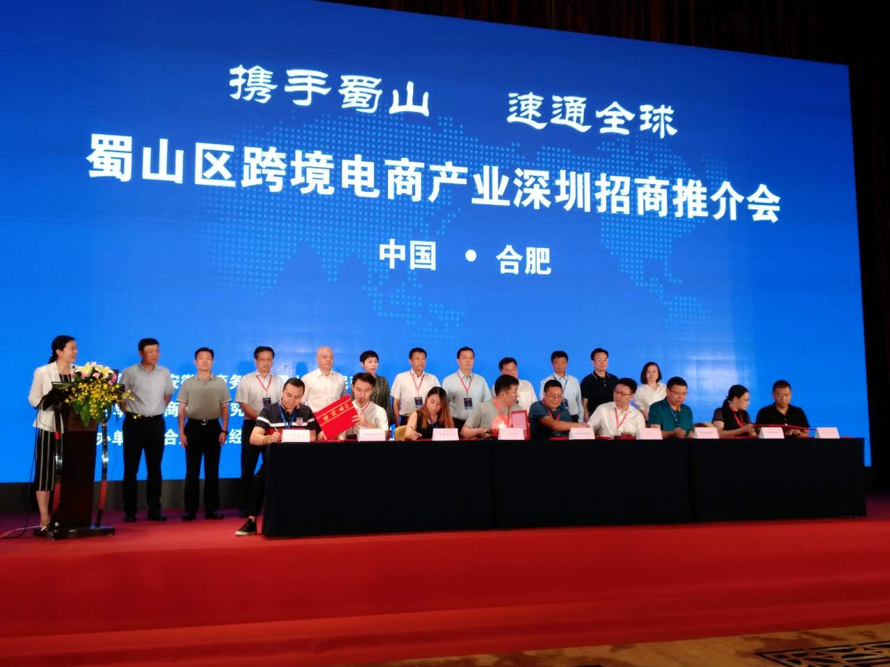 当日,蜀山经济开发区在推介会上与顺丰、怡亚通、北京燕文物流、前燕贝思贝尔、和新实业、广东隽闪等共签署6项合作协议。在“跨境电商 论剑蜀山”高端对话环节,阿里巴巴深圳区域总经理王云芳等六位嘉宾分享了精彩的观点。