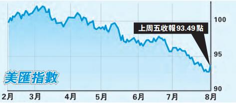 美國上周五公布7月份非農就業數字達20.9萬人,市場預期18.3萬人。而美國7月份失業率為4.3%;平均每小時工資上升0.3%。美國非農業就業數據強勁,減緩了經濟可能放緩的擔憂,美匯指數因此從92.70上漲至93.50,並創下今年最大單日漲幅。美國聯儲局(Fed)正密切注意工資數據,以研判勞工市場是否持續走強,通貨膨脹壓力是否上升。