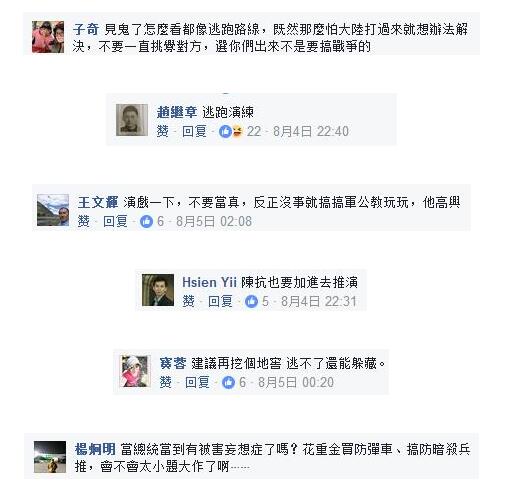 有網友對蔡英文如此緊張兮兮的演練表示不解,“有被害妄想癥嗎?花重金買防彈車、搞防暗殺兵推,會不會太小題大做了啊?”也有網友說,“怎么看都像逃跑路線”,還有網友諷刺,“既然怕大陸打過來就想辦法解決,不要一直挑釁對方,選你們出來不是搞戰爭的。”