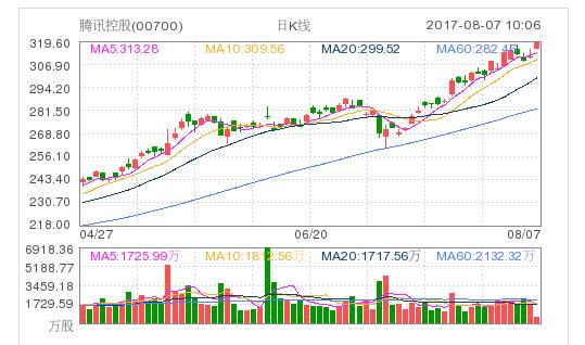 騰訊今早高開高走,盤中漲近2.5%報319.2港元,股價再創曆史新高。截至發稿騰訊漲2%,報318.4港元,成交額19億港元,成交量590萬股,市值突破3萬億港元。中金發表報告,維持對騰訊“買入”投資評級,目標價上調17%至364港元,此相當於2018年核心每股盈利預測30倍。