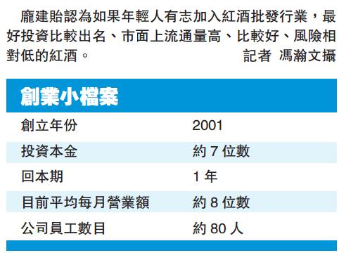 談到年輕人創業,龐建貽認為如果年輕人有志加入紅酒批發行業,最好投資比較出名、市面上流通量高、比較好、風險相對低的,如五大酒莊出產的紅酒:拉菲(Lafite)、瑪歌(Margaux)、拉度(Latour)、侯貝(Haut-Brion)和木桐(Mouton Rothschild),柏翠(Petrus)、白馬(Cheval Blanc)和奧松(Ausone)也可留意。