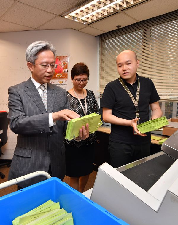 羅智光(左)參觀稅務局文件處理中心,了解員工處理報稅表的流程。