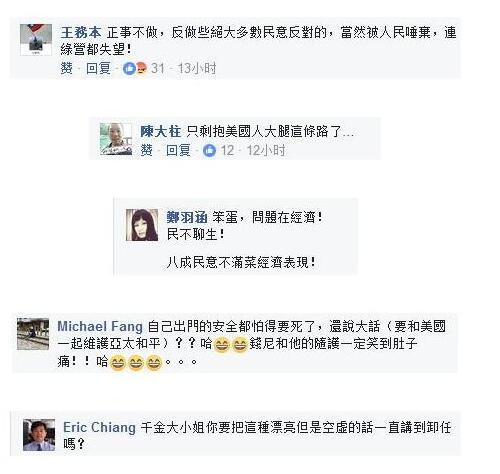 有網友感嘆:“台灣只剩下抱美國大腿這條路了”,“正事不做,反做些絕大多數民意反對的,當然被人民唾棄。”也有網友指出,台灣最重要的是“搞好經濟”,還有網友嘲諷:“自己出門的安全都怕得要死了,還說大話(要和美國一起維護亞太和平)?切尼和他的隨護一定笑到肚子痛!”