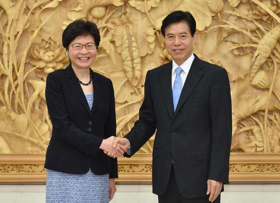 當日中午,林鄭一行與商務部部長鍾山會面并出席其所設午宴。雙方就支持香港參與「一帶一路」建設、《內地與香港關於建立更緊密經貿關系的安排》(CEPA)系列協議的落實和擴大開放、支持香港參與國際和區域經濟合作等議題進行了交流。