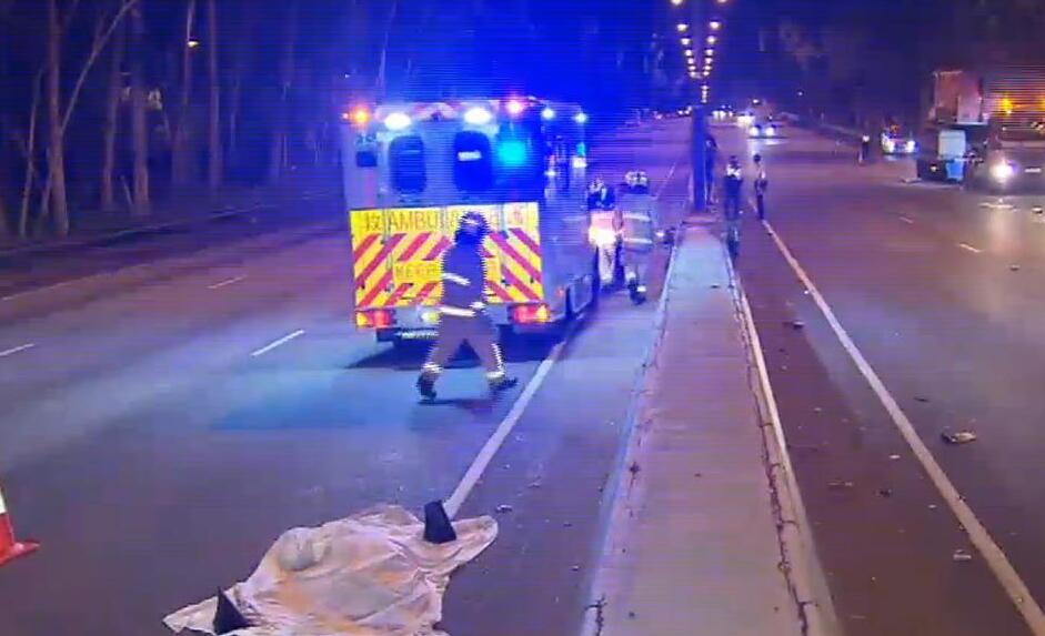 司機被拋出車外,倒臥對面行車線死亡(白色布覆蓋)。