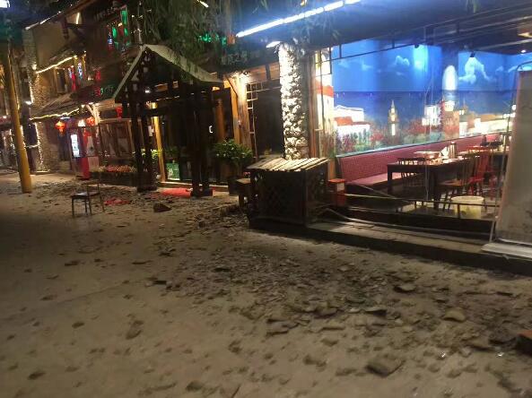 2017年8月8日,四川阿壩州九寨溝縣發生7.0級地震,這是九寨溝景區游客中心附近受損的街區。新華社發