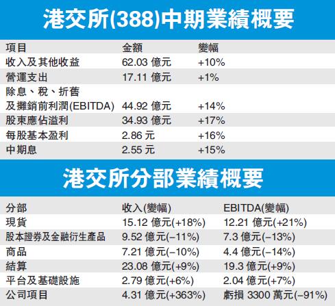 期內,現貨分部大豐收,收入為15.12億元,按年增長18%,其中來自「滬港通」及「深港通」的收入為1.62億元,較去年同期的7100萬元,激增1.28倍;該分部除息、稅、折舊及攤銷前收入(EBITDA) 按年增長21%,至12.21億元。
