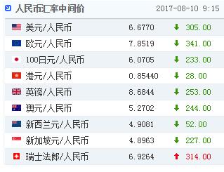 8月10日,人民幣(6.6705, -0.0014, -0.02%)兌美元中間價報6.6770,升破6.7,較上日中間價大幅升值305個基點。