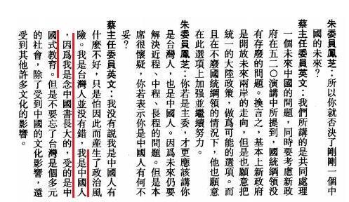 蔡英文則回答“我沒有說我是中國人有什么不好,只是怕因此而產生了政治風險。我是台灣人并沒有錯,我是中國人,因為我是念中國書長大的,受的是中國式教育。”