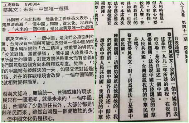 當時的報紙內容還指出,時任台陸委會主委的蔡英文表示,“‘一個中國’是我們必須面對的問題,台灣沒有空間與可能性去逃避一個中國的問題。”蔡英文還認為,無論統一、“台獨”或“維持現狀”,台灣民眾只有一個選擇,就是未來的“一個中國”。據悉,蔡英文當時也承認了關于“九二共識”的相關史實。