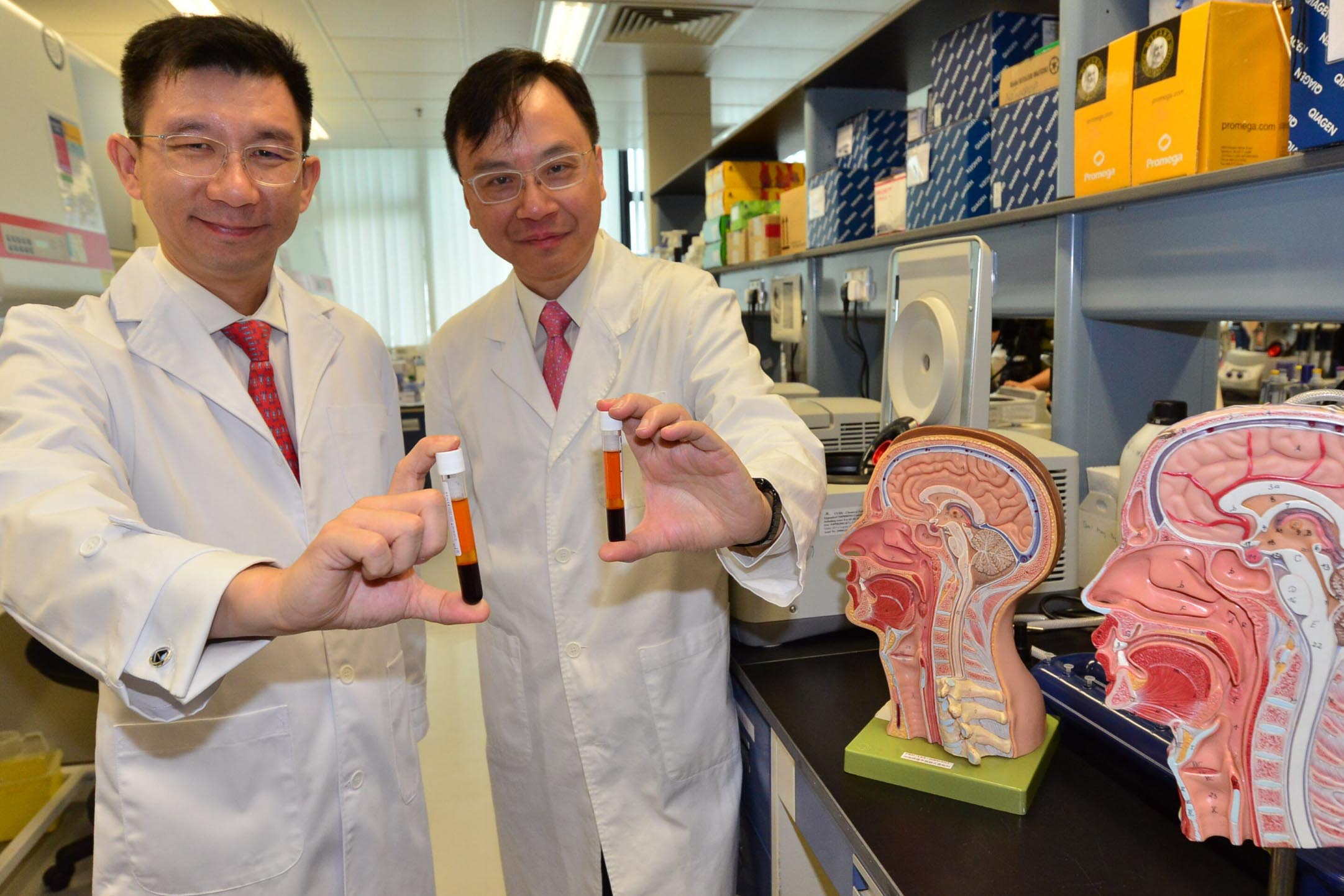 中大李嘉誠健康科學研究所所長盧煜明(右)及醫學院化學病理學系教授陳君賜展示分析的EB病毒血液。记者冯俊文摄