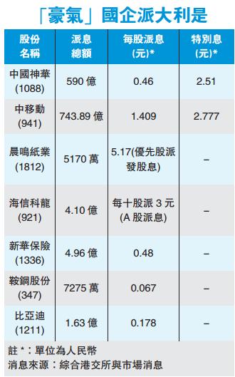 中移動并非今年首家國企派發特別股息。國資委去年底表示,上市公司應多分紅,多賺取利潤回報股東,這番言論,起初市場不以為然,至今年上半年,中國神華宣布派發特別股息每股2.51元,加上0.46元的末期息,神華并派2.97元。無獨有偶,當時中國神華副董事長兼總裁凌文表示,派發特別股息是應基金經理、投資者要求,與中移動的派息理由不謀而合。