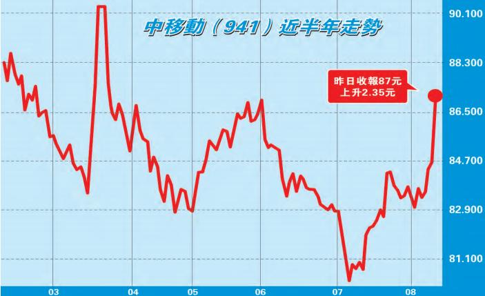 【香港商報网訊】記者鄭珊珊報道:中移動(941)昨公布業績,截至6月底,純利626.75億元(人民幣,下同),同比增長3.5%。中期派息每股1.409元(折合1.623港元),特別息每股2.777元(折合3.2港元),合共每股派發4.186元(折合4.823港元)。中移動午后抽高,收報87元,升2.78%。