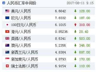 8月11日,人民幣(6.6667, 0.0208, 0.31%)兌美元中間價報6.6642,上日中間價6.6770。中間價連續4日調升,為去年9月22日來新高,本周累計調升490個基點。