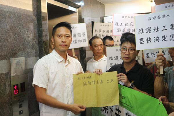 「政中香港人」召集人劉礎慊冀社工註冊局能盡快向市民交代,以維護公眾對社工專業信心。請願人士高叫「違反操守未懲處,盡快釘牌莫再拖」、「犯事不用懲罰,社局教壞細路」、「社工包庇社工,盡快決定懲處」等口號,并向社局主席倫智偉遞交請願信后和平散去。