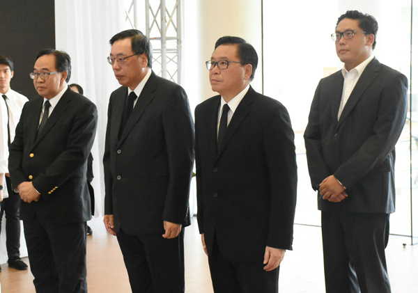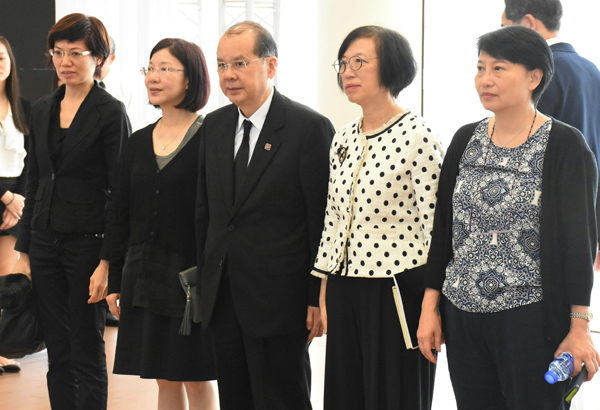 張建宗(左三)及陳肇始(左二)弔唁發叔表達哀思。 記者馮瀚文攝