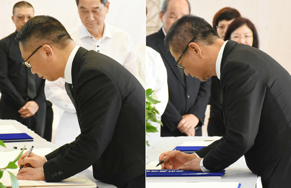 袁國強(圖左)及陳茂波在弔唁冊留言。