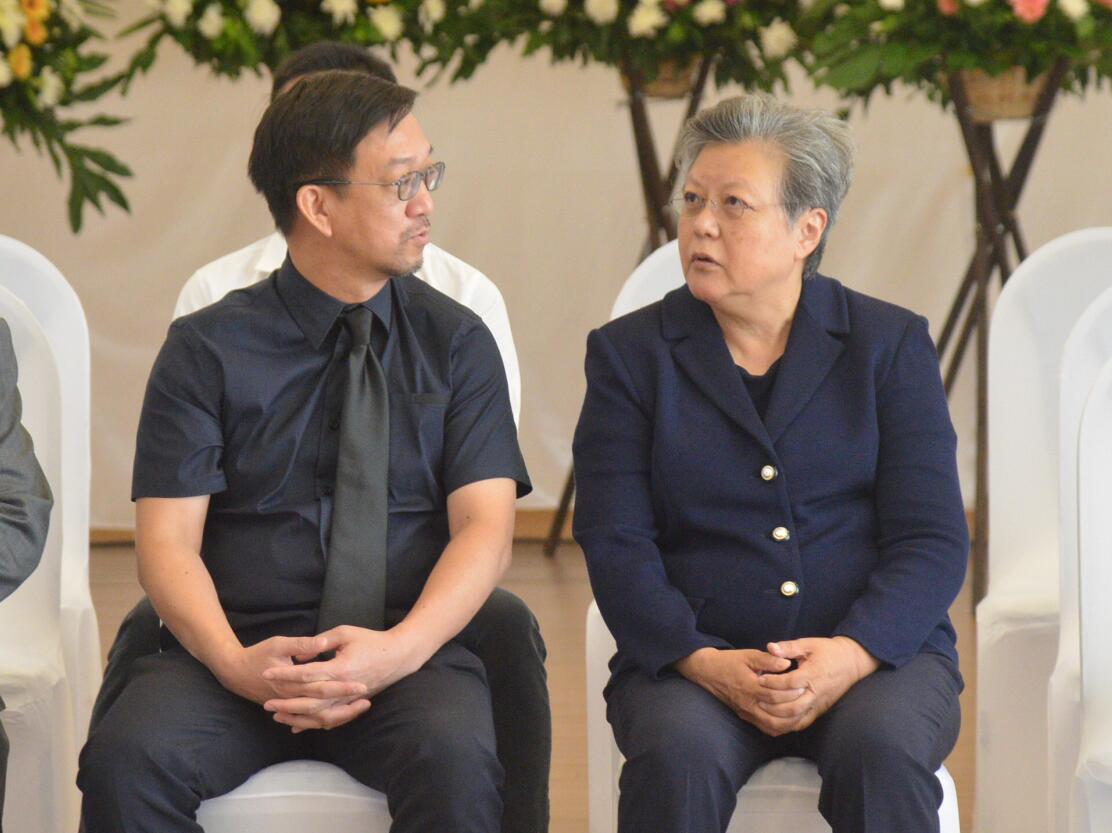 范徐丽泰(右)与刘业强交谈追思发叔。记者蔡启文摄