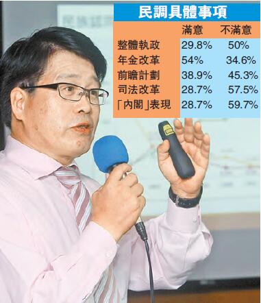 游盈隆認為,這是蔡英文上任至今,民意支持最低的時刻,他認為原因很多也很明確,經過复雜統計分析,最重要是,拚經濟表現高度不滿;兩岸關系持續緊張,看不到出路;林全「內閣」表現不佳,民眾高度不滿;「一例一休」勞工政策冲擊還沒消退;「同性婚姻」合法化疑慮;前瞻計劃(4千億新台幣基建計劃)爭議多;司法改革充滿期待,結果讓人大失所望。