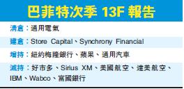 監管文件顯示,巴郡上季盡沽持有的1060萬股通用電氣持股,總值料達3.15億美元;亦減持IBM及富國銀行,但同時增持通用電氣前消費貸款子公司SynchronyFinancial、紐約梅隆銀行及蘋果公司。以周一收市價計,巴郡目前持有蘋果市值約2085萬美元。