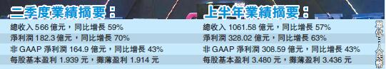 從騰訊昨天公布的截至2017年6月30日未經審核的二季度及中期綜合業績來看,今年第二季度,騰訊總收入為566.06億元,比去年同期增長59%,其中網絡游戲收入238.61億元;按非通用會計準則,期內盈利為164.87億元,比去年同期增長43%。至此,騰訊上半年總收入達1061.58億元,同比增長57%,純利同比增長63%至328.02億元,若按非通用會計準則,期內盈利為308.59億元,比去年同期增長43%。