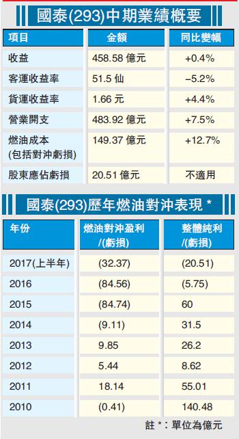 截至6月30日止的6個月,國泰半年收益458.58億元,同比升0.4%。期內客運收益率51.5仙,同比跌5.2%;貨運收益率1.66元,同比升4.4%;營業開支483.92億元,同比增7.5%,包括對冲虧損在內的燃油成本149.37億元,虧損同比增加12.7%。