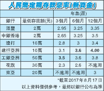 另外,投資者定存人民幣時需要留意,由於人民幣受制於匯率風險,如果日後需要將人民幣兌換成港幣或其他外幣時,可能會受人民幣匯率變動影響,利息回報跟上大市上落,隨時賺息蝕匯。因此,大家進行任何投資時,應評估市場的風險,謹記投資涉及風險,沒有穩賺不蝕的投資工具!