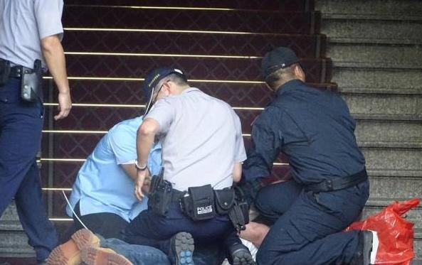 该男子立即被其他“宪兵”制服,警方也来赶来支援,抬走行凶男子。