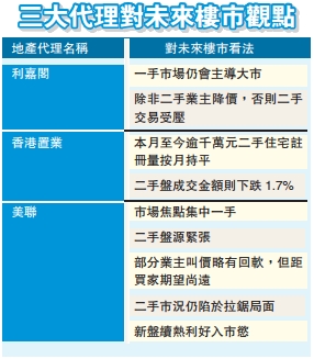 美聯物業住宅部行政總裁布少明表示,新盤絡繹不絕,開價緊貼同區二手,入票反應熱烈,發展商更迅速宣布加推,吸納市場部分購買力。市場焦點集中一手,二手盤源相對緊張,部分業主叫價略有回軟,但距買家期望尚遠,二手市况仍陷於拉鋸局面。
