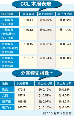 CCL(大型單位)報160.13點,連續2周創歷史新高,按周升0.03%,連升4周共1.04%。豪宅樓價升勢持續,明顯不受大市影響,指數續創新高。近11周計,CCL(大型單位)九升兩跌,當中七次創新高,11周累升2.79%。