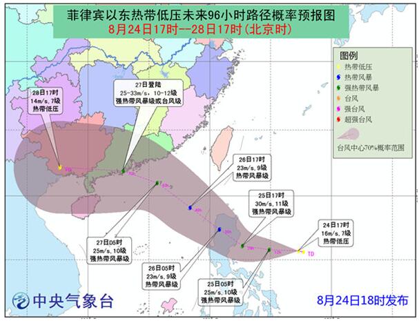 預計,該熱帶低壓將以每小時20-25公裏的速度向偏西方向移動,強度逐漸加強,將於12小時內發展為今年第14號台風,並於25日傍晚前後在菲律賓呂宋島東部沿海登陸,以後穿過呂宋島,將於26日白天移入南海東部海面,轉為向西北方向移動,逐漸向廣東中部到海南東部一帶沿海靠近,並將於27日在上述沿海登陸(25-33米/秒,10-12級,強熱帶風暴級或台風級)。