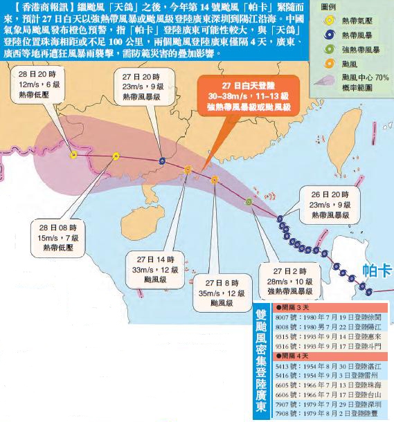 一風未平一風又起,重創中國東南沿海的台風「天鴿」剛剛停編,今年第14號台風「帕卡」(熱帶風暴級)緊接著生成,裹挾風雨正向廣東沿海奔襲。「帕卡」以30公里/小時左右速度向西偏北方向移動,強度逐漸加強,昨晚10時台風中心位於陽江市東南方約530公里的南海東北部海面上,將於27日在廣東深圳到陽江一帶沿海登陸,登陸強度預計為強熱帶風暴級或台風級。中央氣象台8月26日17時繼續發布台風橙色預警以及發布暴雨黃色預警,中國國家海洋局則緊急啟動海洋災害三級應急響應,廣東省重大氣象災害應急指揮部26日20時00分升級氣象災害(台風)Ⅲ級應急響應為Ⅱ級,瓊州海峽已經於26日12時全線停航,湛江海域萬艘船舶進入錨地防險。今日珠三角部分鐵路列車有調整,途經廣茂線列車停運,廣珠高鐵亦受影響。